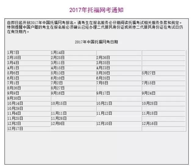 自即日起开放2017年中国托福网考报名。请考生在报名前务必仔细阅读托福考试相关服务条款和规定。特别提醒中国户籍的考生在报名前必须确认已经办理二代居民身份证或所持二代居民身份证在考试日仍在有效期内。