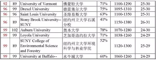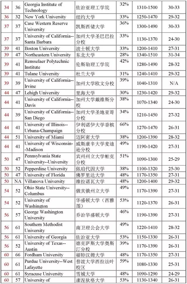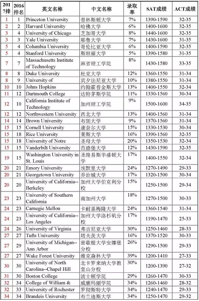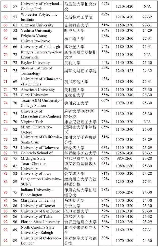 这次排名有很多学校处于并列的位置,可见竞争也是激烈不少。来看美国综合大学TOP100的学校排名,排名中包含SAT/ACT成绩,其中SAT统计的主要是SAT的阅读和数学的总分,两项总分是1600分;ACT的总分是36分。以普林斯顿大学的SAT成绩为例,阅读和数学的总分是1390,在所有被录取的学生中,25%的被录取的学生总分<1390,25%的学生>1590, 50%的学生在1390-1590之间。不能按照此表中SAT/ACT的最低限成绩来选学校,这个区间的数据是根据所有申请者的成绩而摘选的,而不是针对中国学生。被录取的中国学生的标化成绩在所有录取的学生群体中,往往比较高。